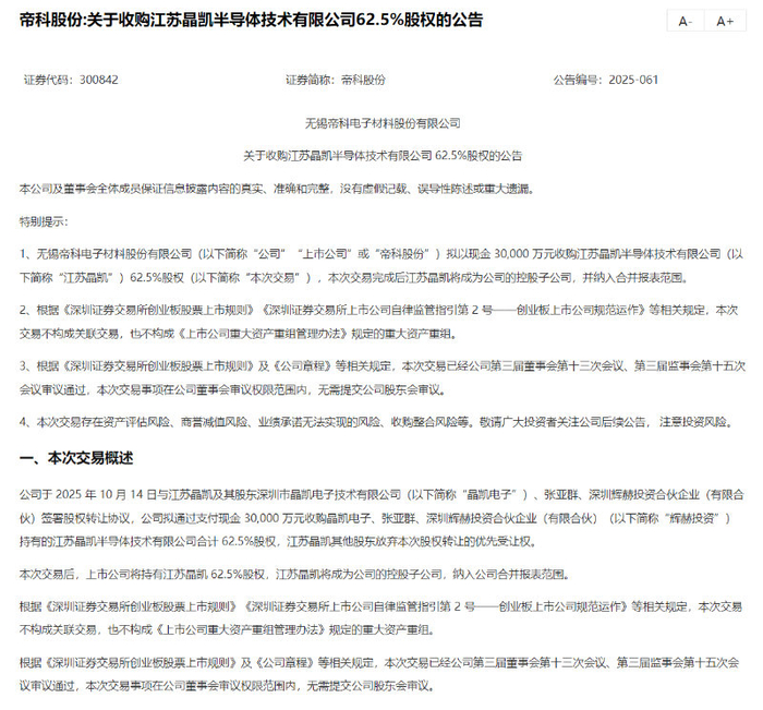 在A股市场并购重组的热潮中,帝科股份以高溢价率跨界收购江苏晶凯的交易备受关注。近日,帝科股份发布公告,拟以3亿元现金收购江苏晶凯半导体技术有限公司(以下简称江苏晶凯)62.5%股权。