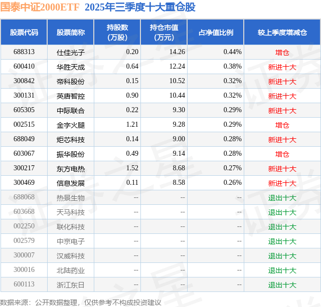 国泰中证2000ETF的前十大重仓股如下: