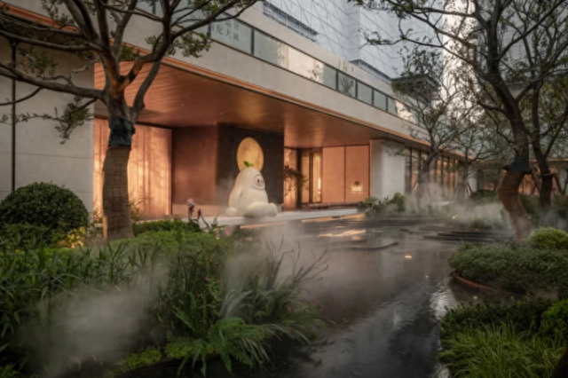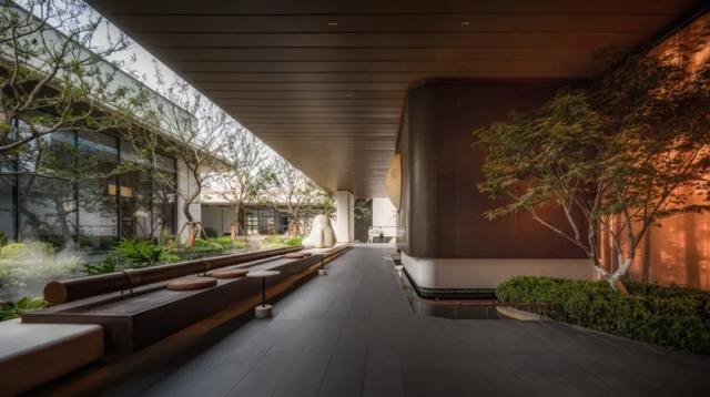 社区内部,“艺树溪谷”下沉庭院将灰空间设计推向立体化延伸,建筑与檐廊环抱形成沉浸式静谧花园。十数棵朴树与渐变奢石水景构成写意山水画卷,“树影光盒”与“圆月”景墙注入诗意光影,雾森与跳泉装置增添灵动森意,全方位营造出自然雅致的景观氛围。檐廊空间兼具观景平台与气候缓冲区的双重功能,居民可在此阅读、会客、观景,实现与自然的舒适互动;建筑底层落地窗构建通透界面,让室内活动与庭院景致相互映衬,达成室内外空间的深度交织。