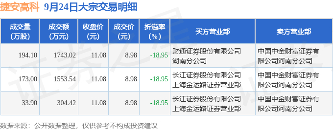 9月24日捷安高科现3笔折价18.95%的大宗交易 合计成交3600.98万元