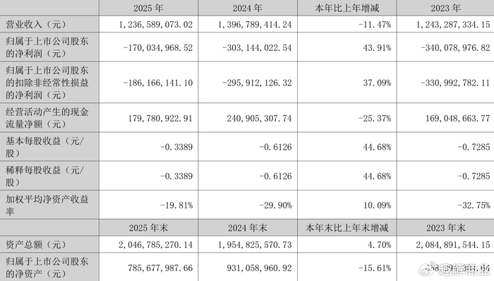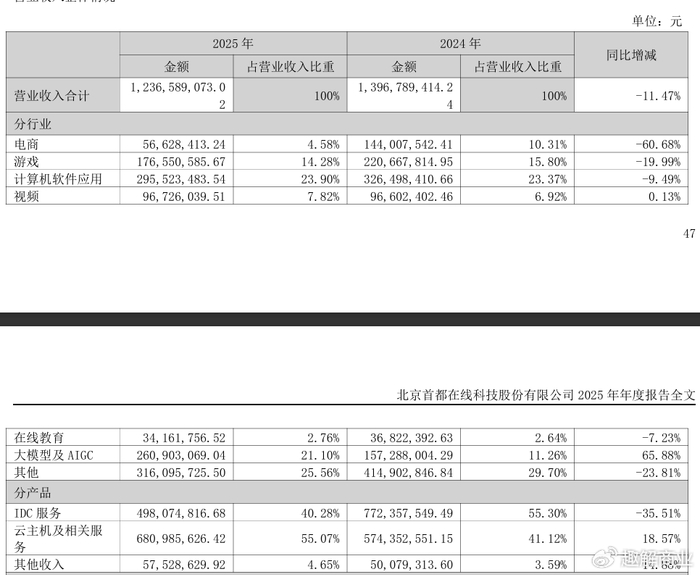 近日,首都在线发布2025年年度报告,该公司营业收入为12.37亿元,同比减少11.47%。归属于上市公司股东的净亏损为1.7亿元,同比收窄43.91%。归属于上市公司股东的扣除非经常性损益的净亏损为1.86亿元,同比收窄37.09%。