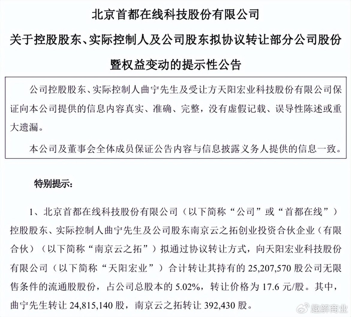 2025年9月,首都在线公告称,公司控股股东、实际控制人曲宁先生及公司股东南京云之拓创业投资合伙企业(有限合伙)拟通过协议转让方式,向天阳宏业科技股份有限公司合计转让其持有的2520.76万股公司无限售条件的流通股股份,占公司总股本的5.02%。
