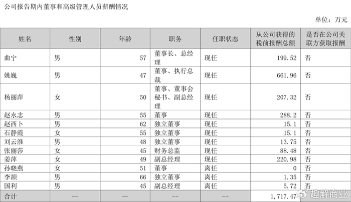 财报显示,公司董事长曲宁2025年从公司获得的税前报酬总额为199.52万元,执行总裁姚巍为661.96万元,董秘杨丽萍为207.32万元,董事赵永志为288.2万元。公司于2025年3月聘任的副总经理姜萍获得了220.98万元的年薪。