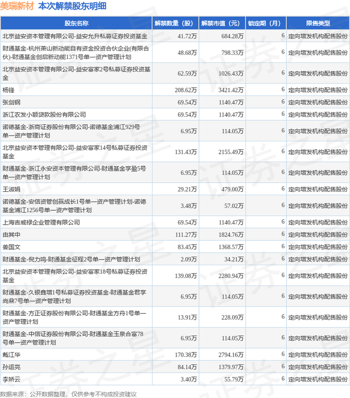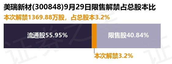 美瑞新材(300848)1369.88万股限售股将于9月29日解禁,占总股本3.2%