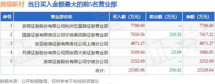 11月3日美瑞新材(300848)龙虎榜数据:游资宁波桑田路上榜
