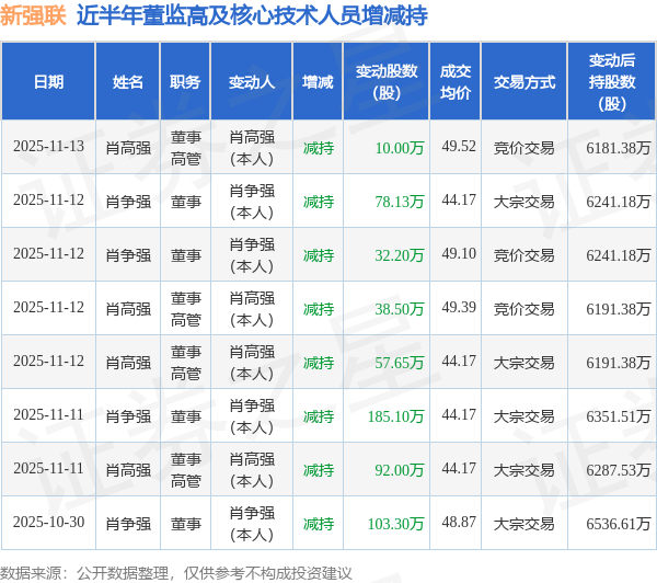 新强联近半年内的董监高及核心技术人员增减持详情如下: