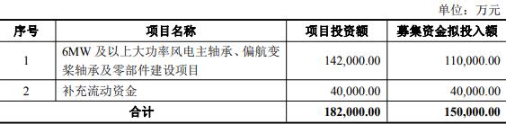 本次向特定对象发行募集资金总额不超过人民币150,000.00万元(含本数),扣除发行费用后的募集资金净额将用于6MW及以上大功率风电主轴承、偏航变桨轴承及零部件建设项目、补充流动资金。