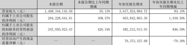 年初至报告期末,公司实现营业收入36.18亿元,同比增长84.10%;归属于上市公司股东的净利润6.64亿元,同比增长1939.50%;扣除非经常性损益后的净利润5.82亿元,同比增长846.59%;经营活动产生的现金流量净额7937.33万元。
