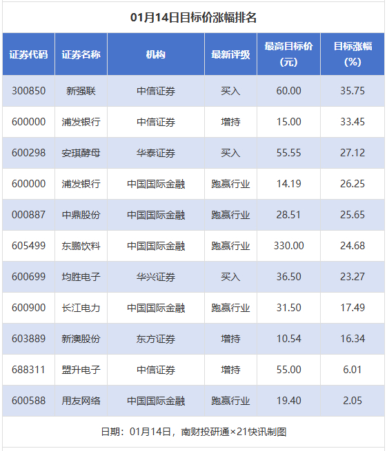 南财投研通数据显示,1月14日,券商给予上市公司目标价共11次,按最新收盘价计算,目标价涨幅排名居前的公司有新强联、浦发银行、安琪酵母,目标价涨幅分别为35.75%、33.45%、27.12%,分别属于风电设备、股份制银行、调味发酵品行业。