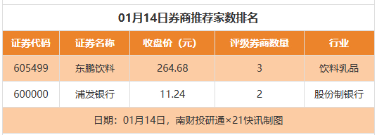 从券商推荐家数来看,1月14日有17家上市公司得到券商推荐,其中东鹏饮料获得3家推荐,浦发银行获得2家推荐,保利发展获得1家推荐。