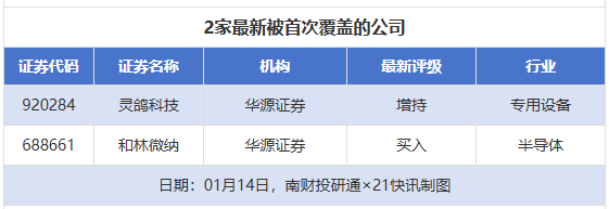 首次覆盖方面,1月14日券商共给出了2次首次覆盖,其中灵鸽科技、和林微纳获得华源证券分别给予“增持”“买入”评级。