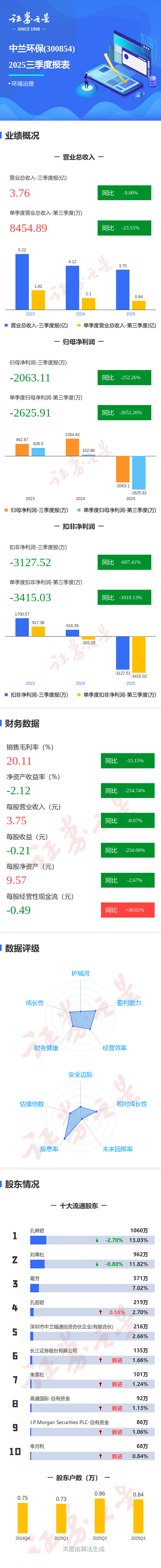 图解中兰环保三季报:第三季度单季净利润同比下降2652.27%