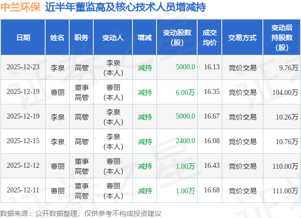 证券之星消息,根据12月24日市场公开信息、上市公司公告及交易所披露数据整理,中兰环保(300854)最新董监高及相关人员股份变动情况:2025年12月23日公司高管李泉共减持公司股份5000.0股,占公司总股本为0.005%。变动期间公司股价上涨0.0%,12月23日当日收盘报16.08元。