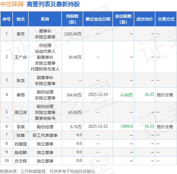 中兰环保的高管列表及最新持股情况如下: