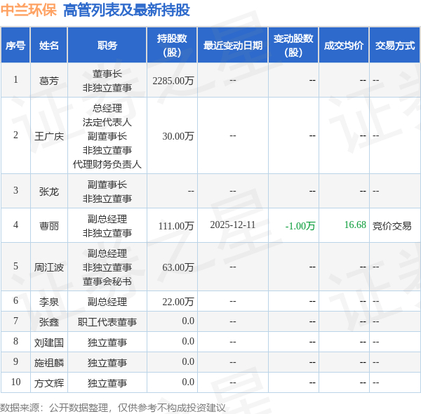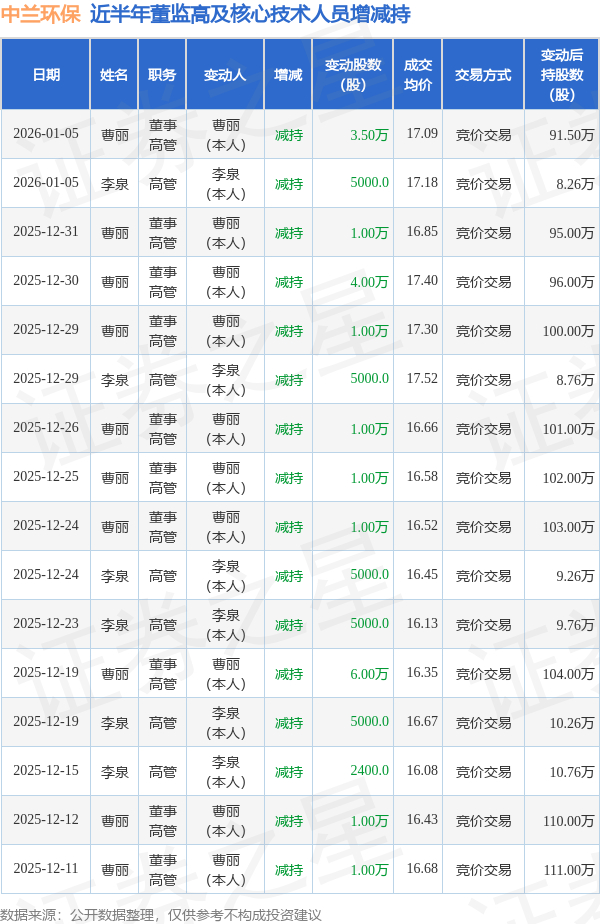 中兰环保近半年内的董监高及核心技术人员增减持详情如下: