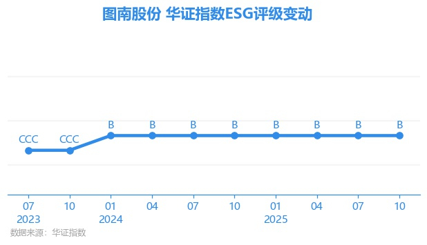 日前,华证指数公布了新一期(2025年10月31日)的ESG评级结果,图南股份(300855.SZ)获得B评级(华证指数评级为C起至AAA九档,C为最低档,AAA为其最高一级评级/AA为其第二档),上一期(2025年7月31日)ESG评级为B。本期ESG评级在206家金属与采矿行业A股上市公司中排名第121(上一期排名第119)。