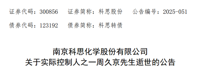 瑞财经 钟鸣辰 10月10日晚,科思股份(SZ300856)发布公告称,公司实际控制人之一周久京近日因病不幸逝世,享年82岁。
