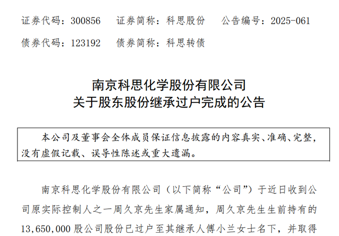 公告显示,南京科思化学股份有限公司原实际控制人之一周久京因病逝世,根据江苏省南京市南京公证处出具的《公证书》,其生前持有的1365.00万股公司股份由配偶傅小兰继承。近日,公司收到傅小兰提交的《证券过户登记确认书》,确认周久京生前持有的1365.00万股公司股份非交易过户至傅小兰名下的手续已于2025年11月27日办理完毕。此前傅小兰女士未持有公司股份,也未在公司任职。本次继承过户登记完成后,傅小兰持有公司1365.00万股,占公司总股本的2.87%,股份性质为无限售流通股。