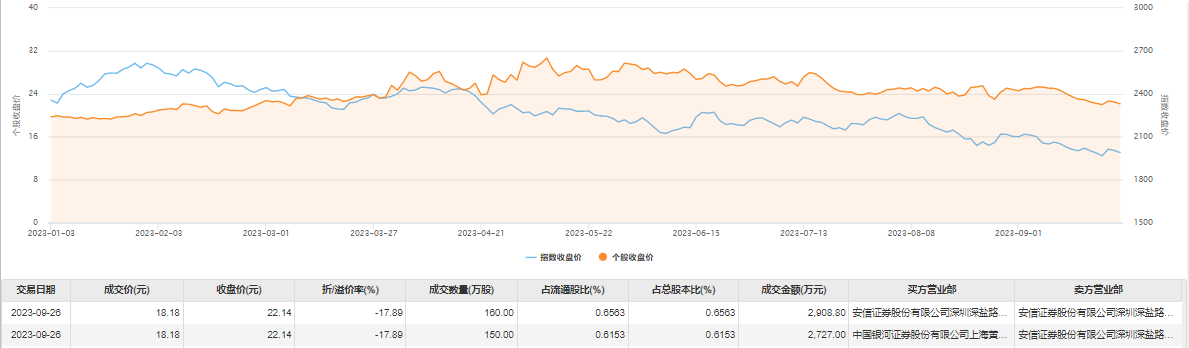 9月26日大宗交易成交310万股,成交额5635.8万元,占当日总成交额的33.94%,成交价18.18元,较市场收盘价22.14元折价17.89%。
