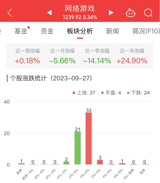 中国经济网北京9月27日讯今日,网络游戏板块整体涨幅0.34%,其中37只股票上涨,4只股票平盘,24只股票下跌。
