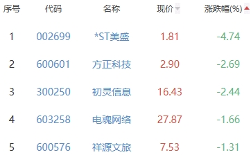 *ST美盛、方正科技、初灵信息、电魂网络、祥源文旅位列涨幅榜后五位,涨幅分别为-4.74%、-2.69%、-2.44%、-1.66%、-1.31%。