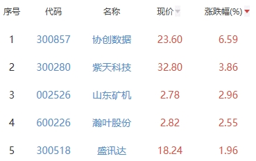 其中,协创数据、紫天科技、山东矿机、瀚叶股份、盛讯达位列板块涨幅前五位,涨幅分别为6.59%、3.86%、2.96%、2.55%、1.96%。