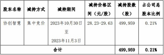 中国经济网北京11月8日讯协创数据(300857.SZ)昨日晚间发布关于控股股东权益变动的提示性公告。公司控股股东协创智慧科技有限公司(以下简称“协创智慧”)于2023年10月30日至2023年11月3日期间通过集中竞价交易方式减持公司股份合计499,959股,占公司总股本比例0.21%,减持价格区间为28.23元/股至29.63元/股。