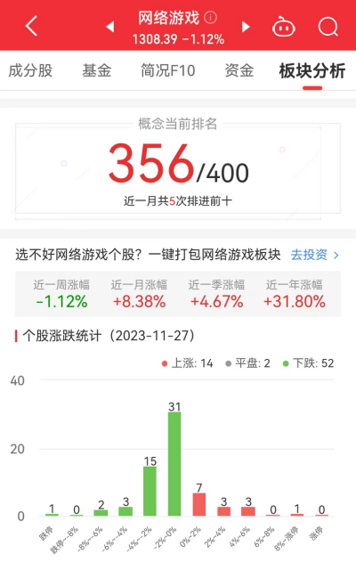 中国经济网北京11月27日讯今日,网络游戏板块整体涨幅-1.12%,其中14只股票上涨,2只股票平盘,52只股票下跌。