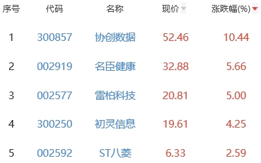 其中,协创数据、名臣健康、雷柏科技、初灵信息、ST八菱(维权)位列板块涨幅前五位,涨幅分别为10.44%、5.66%、5.00%、4.25%、2.59%。