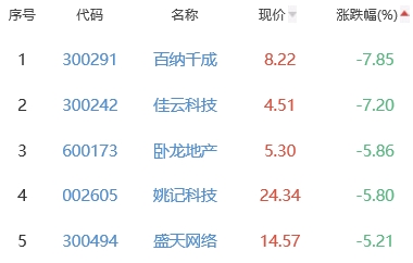百纳千成、佳云科技、卧龙地产、姚记科技、盛天网络位列涨幅榜后五位,涨幅分别为-7.85%、-7.20%、-5.86%、-5.80%、-5.21%。