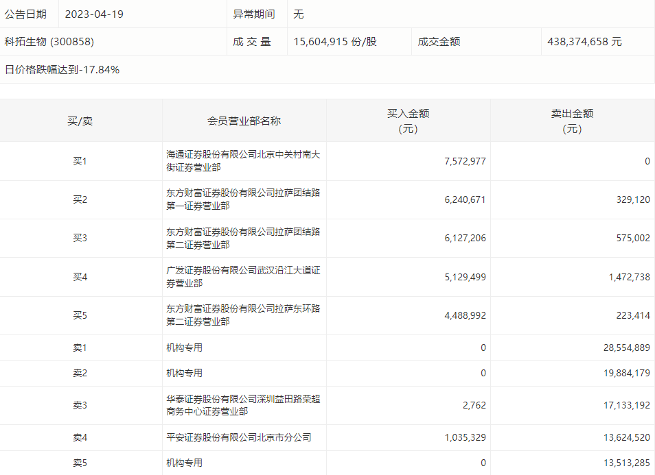 4月19日,科拓生物今日跌17.84%,龙虎榜数据显示,上榜营业部席位全天成交1.26亿元,占当日总成交金额比例为28.72%。其中,买入金额为3059.74万元,卖出金额为9531.03万元,合计净卖出6471.29万元。