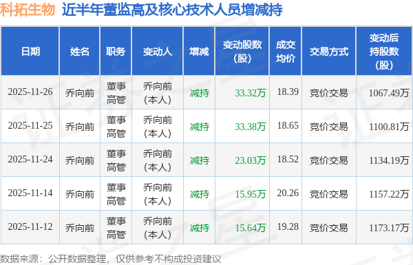 科拓生物:11月26日高管乔向前减持股份合计33.32万股