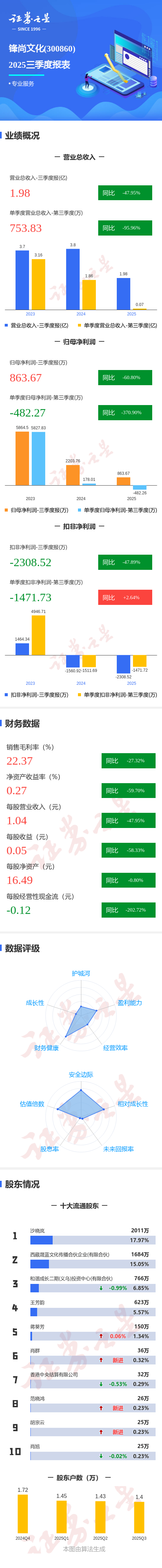 图解锋尚文化三季报:第三季度单季净利润同比下降370.91%