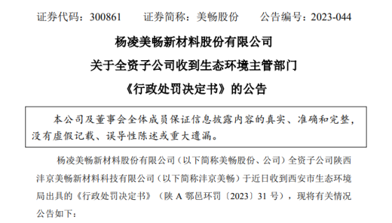 中国网财经6月5日讯(记者 张增艳)美畅股份日前公告称,公司全资子公司陕西沣京美畅新材料科技有限公司(下称“沣京美畅”)近日收到西安市生态环境局出具的《行政处罚决定书》(陕A鄠邑环罚〔2023〕31号)。