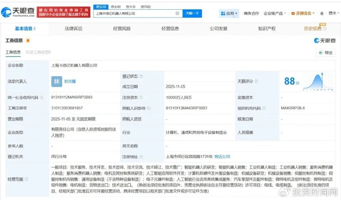 天眼查工商信息显示,11月5日,上海卡倍亿机器人有限公司成立,法定代表人为林光耀,注册资本1亿人民币,经营范围包括智能机器人的研发、智能机器人销售、工业机器人制造等。股东信息显示,该公司由卡倍亿(300863)全资持股。