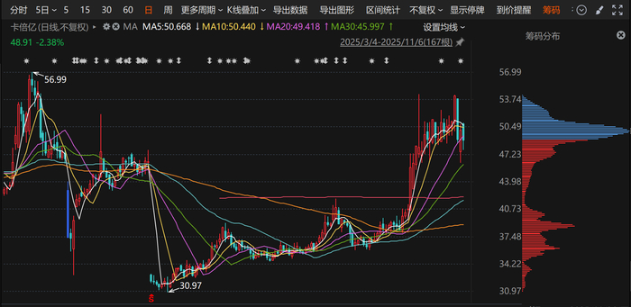 11月6日,截至午间收盘,卡倍亿跌2.38%,报48.91元/股,总市值92.04亿元,年内股价涨超50%。