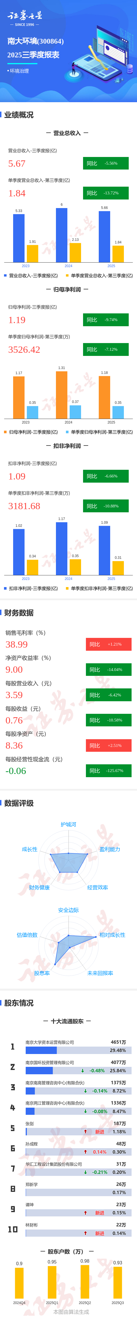 图解南大环境三季报:第三季度单季净利润同比下降7.12%