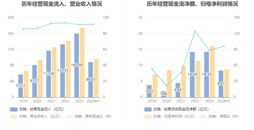 2024年上半年,公司营业收入现金比为91.88%,净现比为96.47%。
