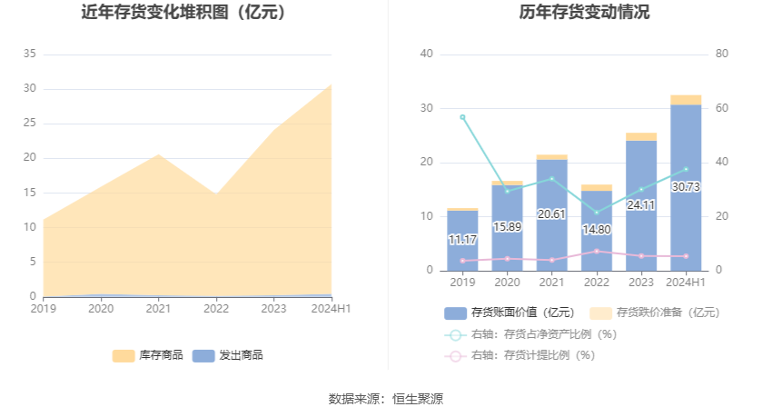 从存货变动来看,截至2024年上半年末,公司存货账面价值为30.73亿元,占净资产的37.6%,较上年末增加6.61亿元。其中,存货跌价准备为1.78亿元,计提比例为5.49%。