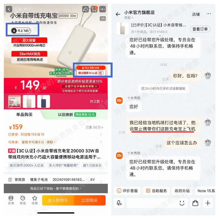 同样发生在召回事件之后,2025年7月28日,哈尔滨的赵先生在淘宝小米官方旗舰店购买了一款充电宝,在售商品页明确标注“可上飞机/火车”。