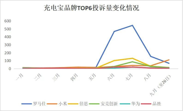 受今年上半年充电宝多起自燃事故、以及相关企业大规模召回事件影响,6月以后罗马仕、小米等充电宝品牌投诉量明显攀升。尤其是罗马仕,今年6月份统计投诉量为220,截至9月26日投诉量为1422,三个月暴涨近7倍。