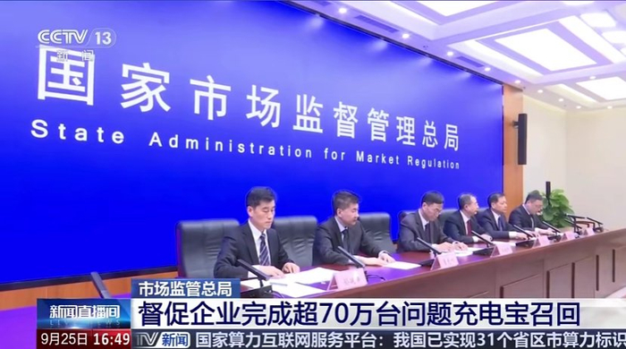 9月25日,据央视新闻报道,针对今年上半年充电宝产品发生多起自燃事故,市场监管总局成立了督导组,现已督促相关企业完成七十多万台存在安全隐患的充电宝产品召回。