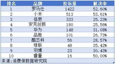 在众多品牌的投诉排名中,罗马仕以1422件投诉量位居榜首,投诉解决率为52.60%;小米以513件投诉位列第二,投诉解决率仅为49.09%。此外,倍思、安克创新等知名品牌也纷纷登上投诉榜单。