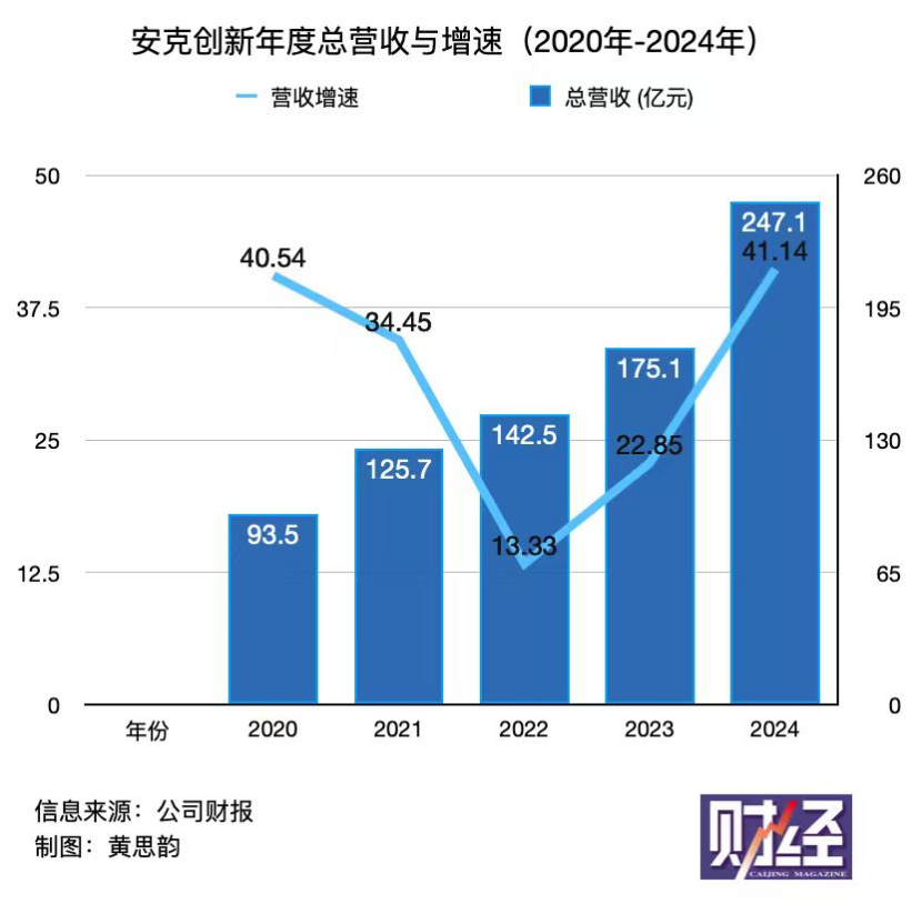 从2020年到2024年,安克创新总营收规模增长了近2.6倍,收入从93.5亿元增长至247.1亿元,归母净利润也从8.5亿元逐步增长至21.1亿元。其营收年复合增速经历了大起大落的过程——从2020年的40.5%,逐步下滑,在2022年触底至13.3%,随后逆势反弹,2024年增速41.4%,创下上市以来的最高纪录。归母净利润的增速也分别在2023年和2024年录得41.2%和30.9%的高增长。