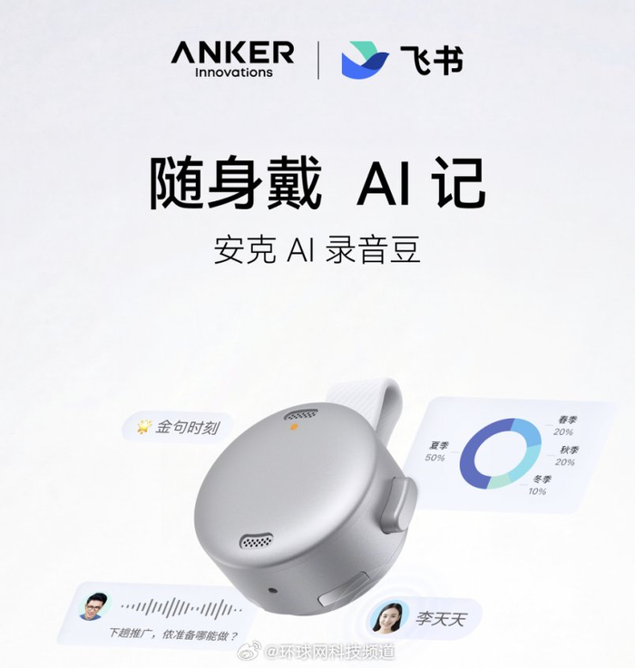 安克创新与飞书联合发布10克AI录音豆,支持声纹识别与实时纪要