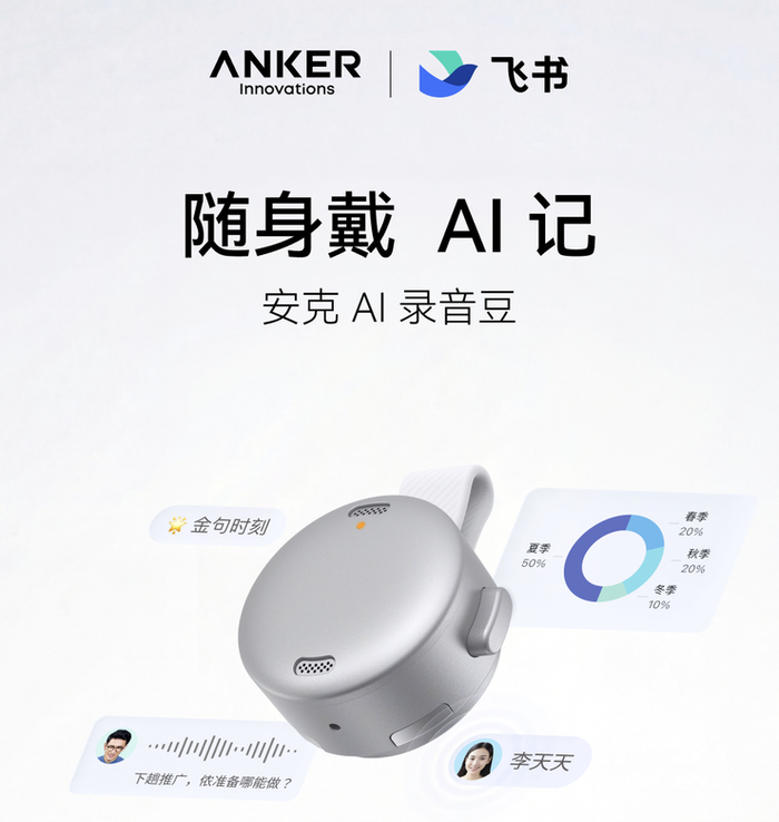 2026 年 1 月 19 日,安克创新与飞书联合发布了最新 AI 硬件——安克 AI 录音豆,飞书提供了该产品的软件 AI 适配与服务。这款产品以极轻的"磁吸纽扣”形态实现无感随身佩戴,基于飞书 AI 能力,支持声纹识别、实时转写与翻译、实时 AI 可视化总结以及智能纪要生成,结合飞书知识问答,将录音变成可协同、可流转的知识资产。