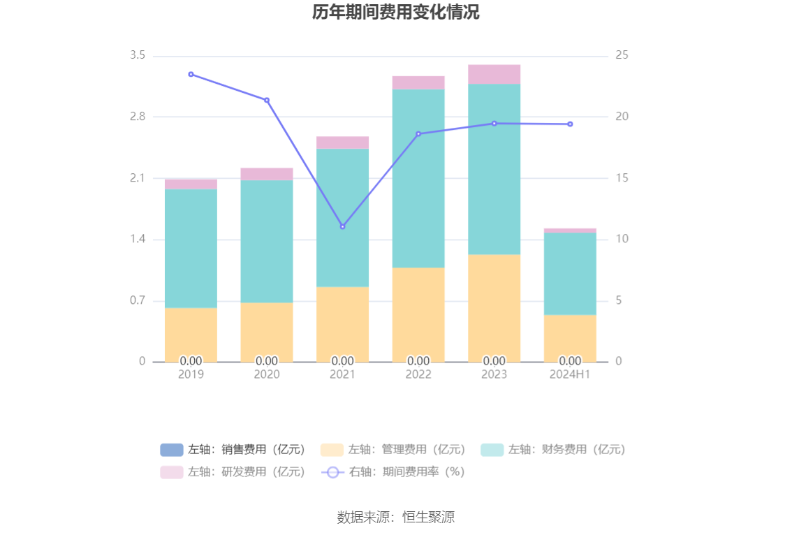 2024年上半年,公司期间费用为1.53亿元,较上年同期减少813.50万元;期间费用率为19.44%,较上年同期下降0.26个百分点。其中,销售费用为5.31万元,管理费用同比增长0.08%,研发费用同比下降45.76%,财务费用同比下降4.3%。