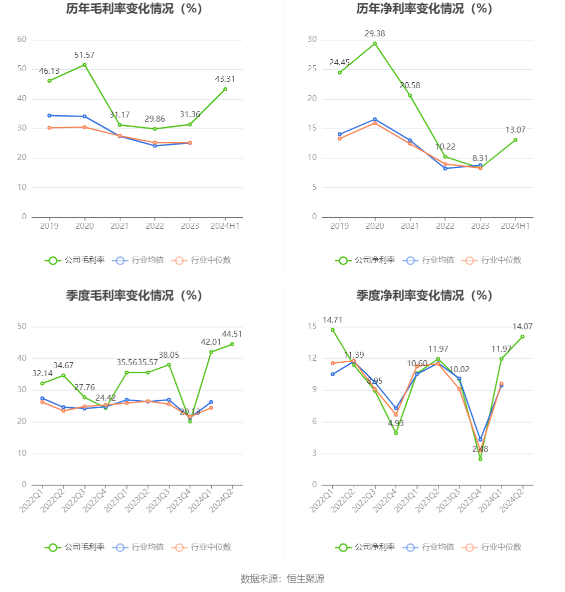 2024年上半年,公司毛利率为43.31%,同比上升7.74个百分点;净利率为13.07%,较上年同期上升1.74个百分点。从单季度指标来看,2024年第二季度公司毛利率为44.51%,同比上升8.94个百分点,环比上升2.50个百分点;净利率为14.07%,较上年同期上升2.10个百分点,较上一季度上升2.10个百分点。