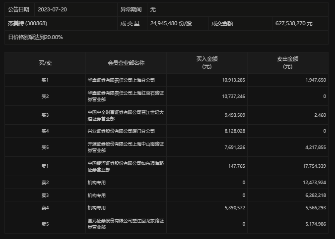 7月20日,杰美特今日涨停,龙虎榜数据显示,上榜营业部席位全天成交1.06亿元,占当日总成交金额比例为16.88%。其中,买入金额为5250.16万元,卖出金额为5341.97万元,合计净卖出91.81万元。