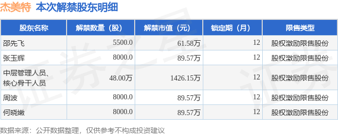 证券之星消息,根据市场公开信息整理,杰美特(300868)于10月24日将有50.95万股限售股份解禁,为公司股权激励限售股份,占公司总股本0.4%。(本次数据根据历史公告整理得出,实际情况以上市公司最新公告为准)本次解禁后,公司还有4726.22万股限售股份,占总股本36.94%。具体如下图所示: